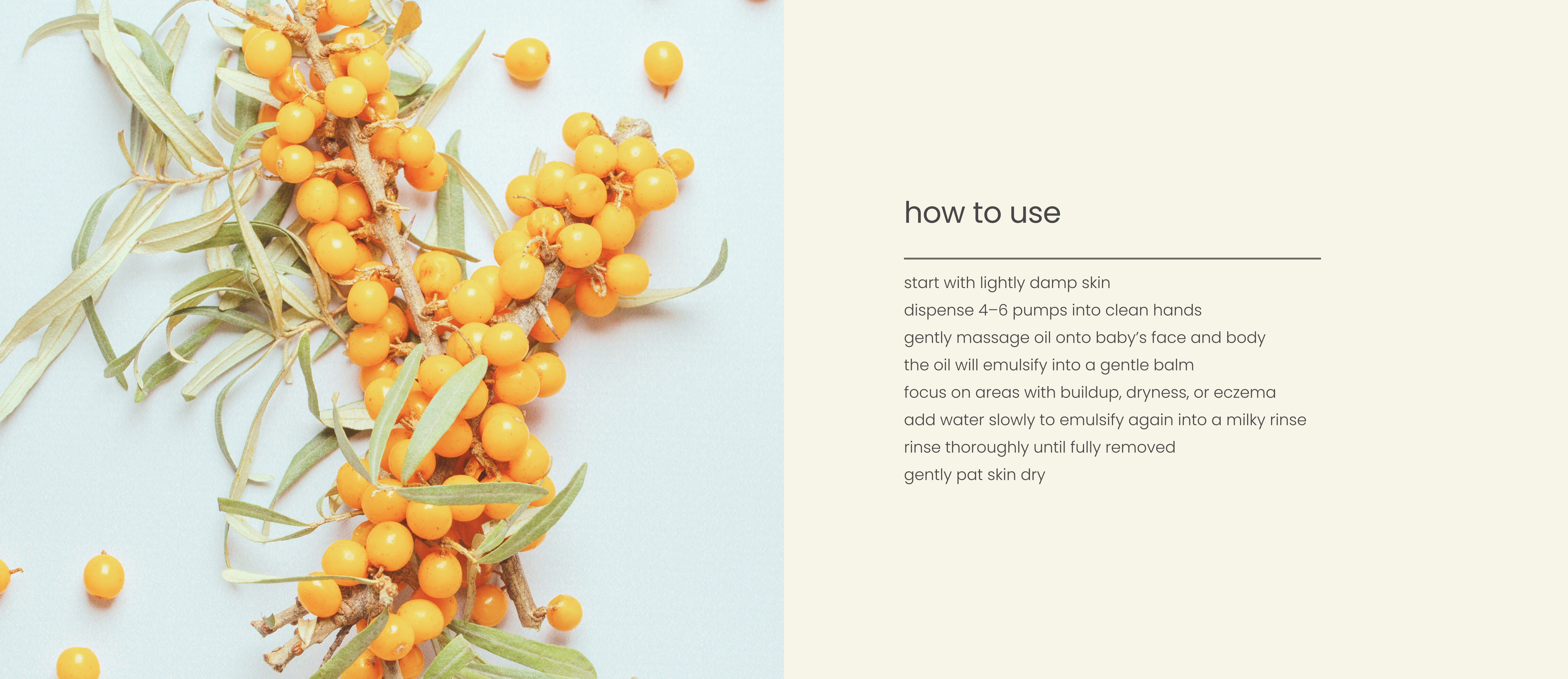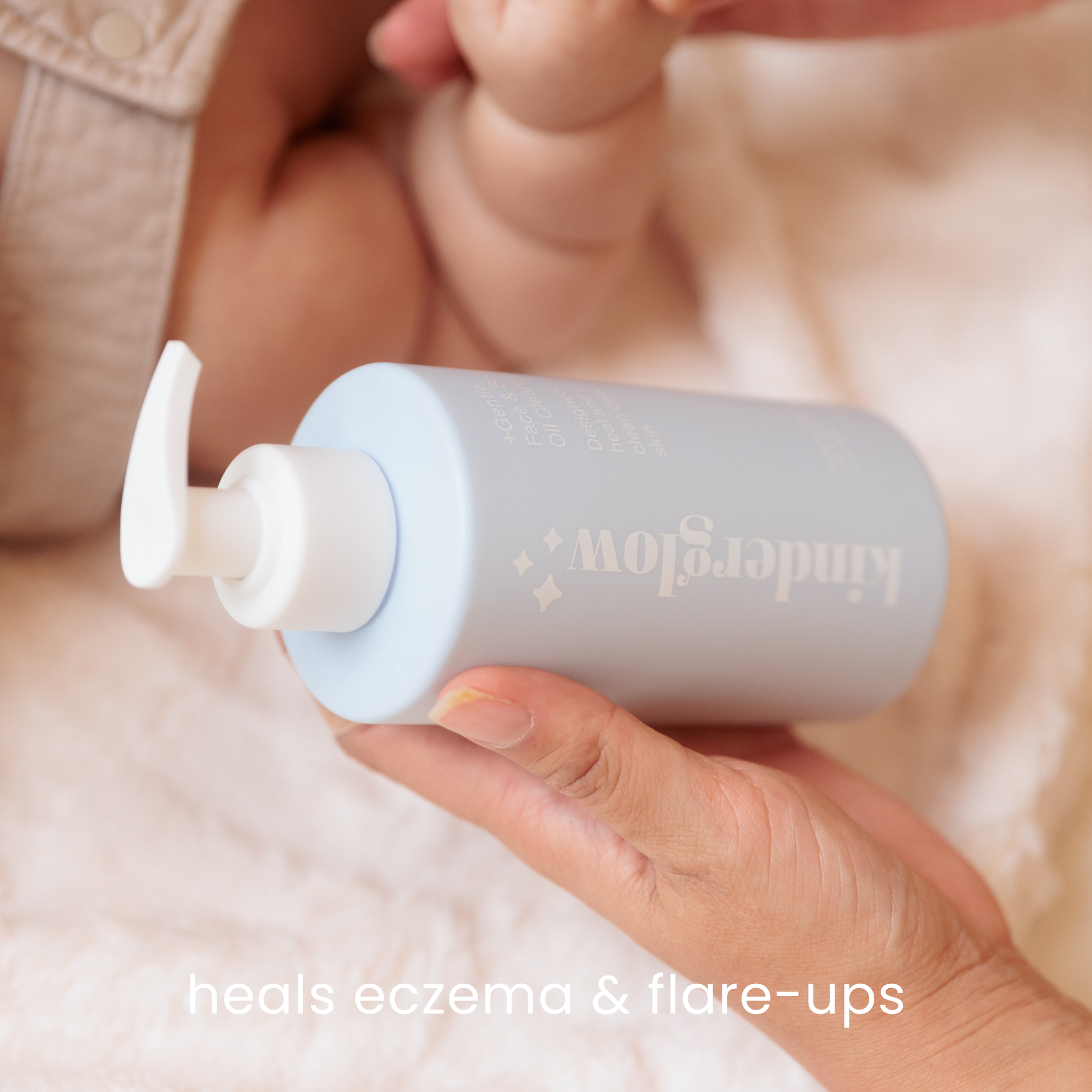 Use this cleanser anytime your baby's skin feels dry, irritated, or out of balance, especially during eczema flare ups, after outdoor exposure, or when skin looks visibly red or rough. It also works beautifully as a daily cleanser or for spontaneous clean ups when your little one gets messy.