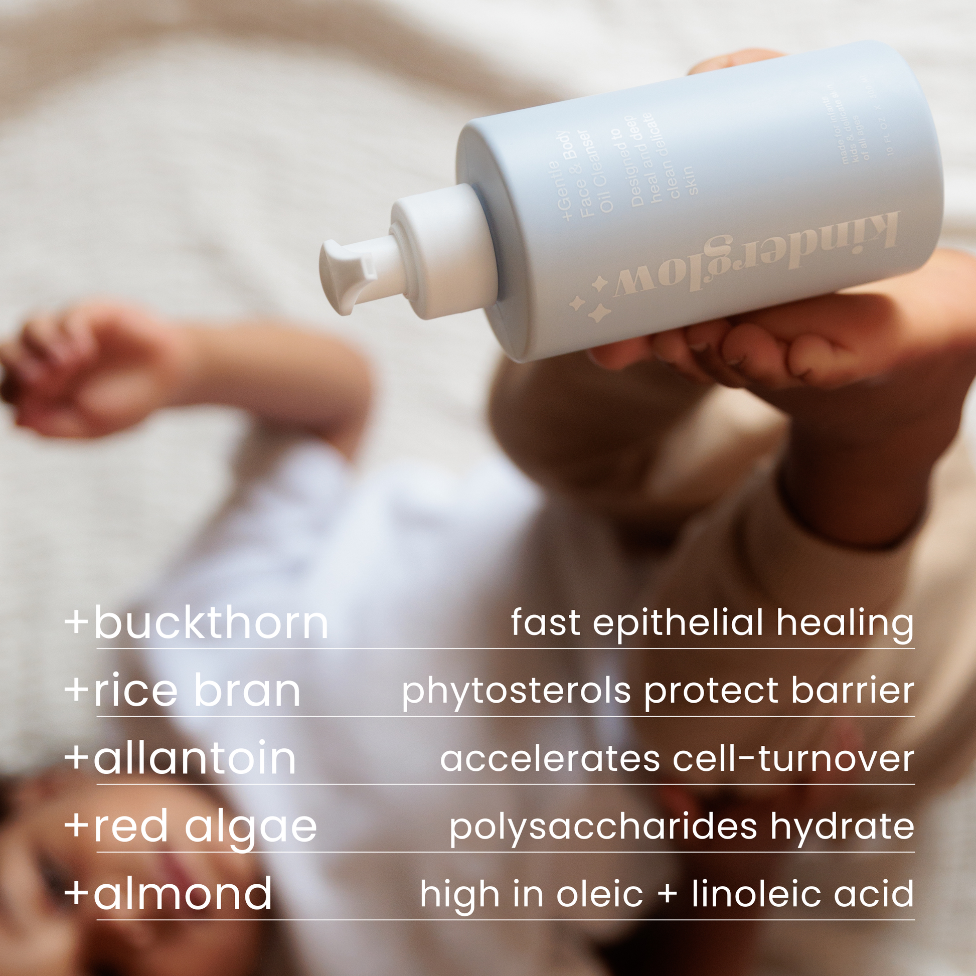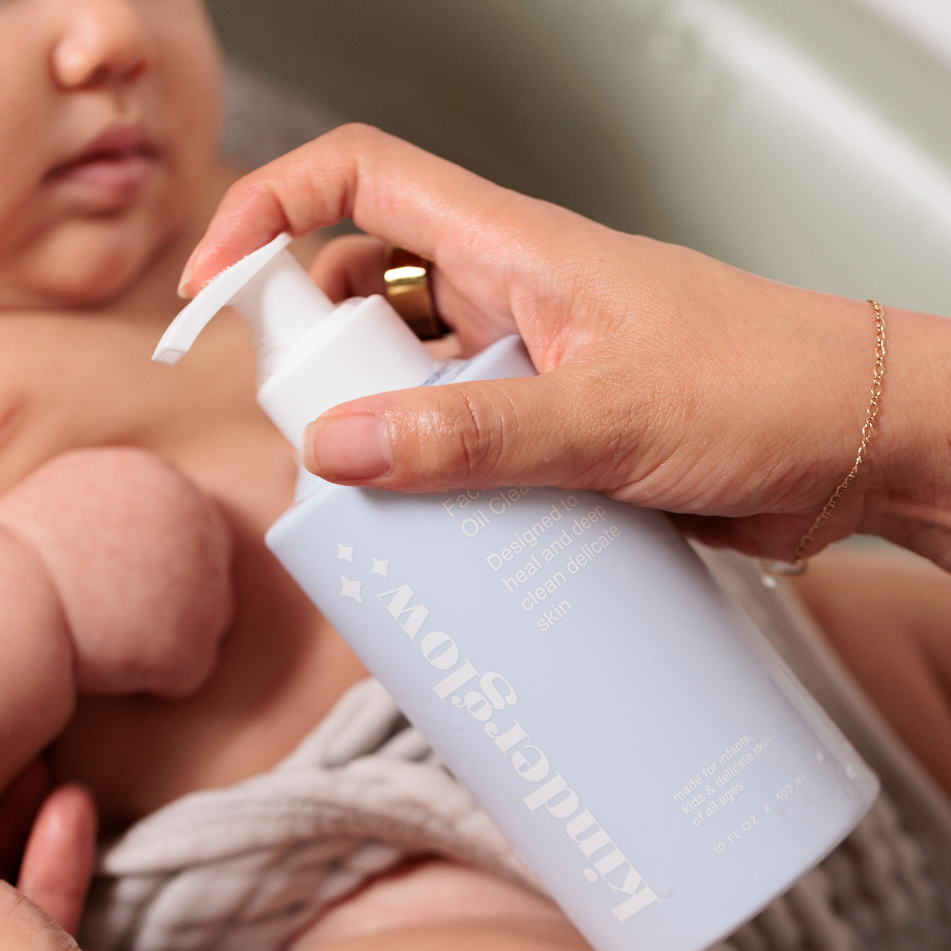 This ultra-gentle, 3-stage oil cleanser is designed for both baby’s face and body. As it melts into the skin, it transitions from a silky oil to a soft balm-like emulsion and rinses off milky clean, leaving no residue behind. Perfect for delicate, eczema-prone skin, it offers deep hydration while gently lifting away impurities, dry patches, and buildup without stripping the skin.